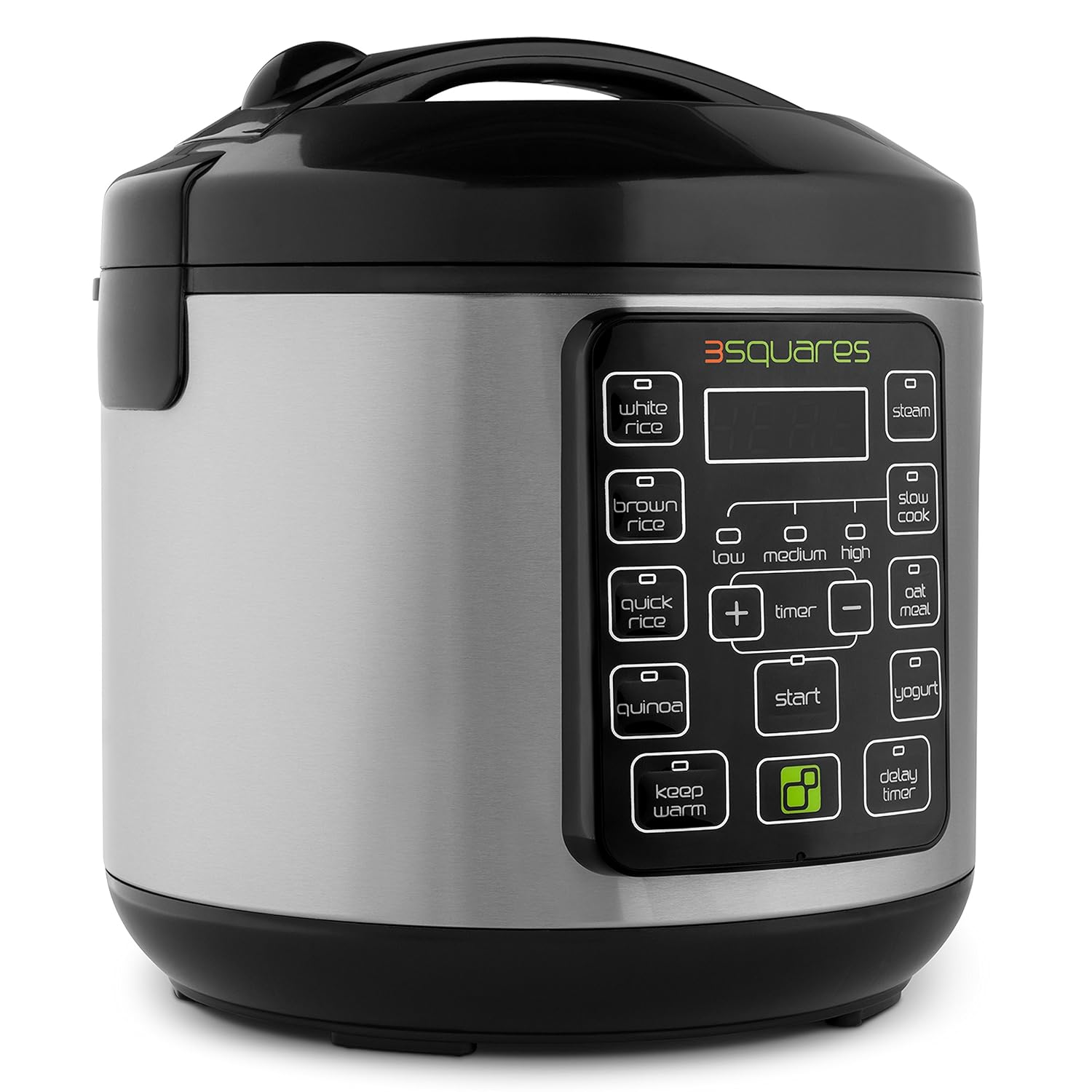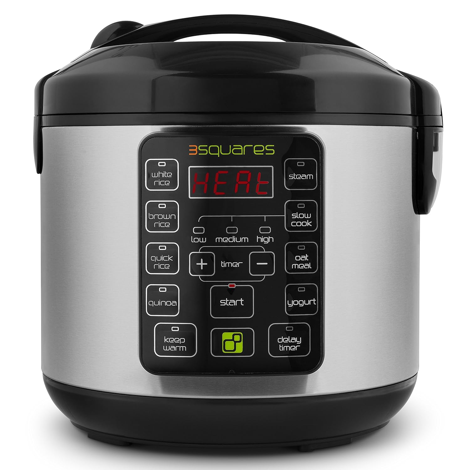 It doesn't travel through time, but the 3 Squares TIM3 MACHIN3 Rice Cooker/Slow Cooker/Food Steamer/Yogurt Maker will make a lot more time for you while making great meals for your family. The TIM3 MACHIN3 cooks rice up to 45% faster than competing rice cookers. While Fuzzy Logic 2.0 and a 20% thicker cooking pot ensures that quickly cooked rice comes out delicious- with no burning! The TIM3 MACHIN3 is also a fully functional programmable slow cooker. High, medium and low settings work just like any single-tasking slow cooker. It's a food steamer too. With a programmable timer that counts down the time your food steams after water reaches a boil in the pot. The included steam tray can also steam food while rice cooks below! And it's a yogurt maker unlike any other. The entire yogurt making process is done within the TIM3 MACHIN3- there's no pots, pans or thermometers to futz with! It will heat milk, hold it at a boil, allow it cool, tell you when it's time to add the culture and cook your yogurt automatically. In addition to all that, it also has an awesome quinoa function that makes that super food super easy to cook. It unlocks the true flavor potential in quinoa so it's not just a gruely bowl of disappointment. The oatmeal function is ideal for steel cut oatmeal (and really all kinds of oatmeal). Fuzzy Logic 2.0 produces deliciously cooked results and keeps it from boiling over! There's also a programmable delay timer that sets up to 15 hours in advance to have rice or oatmeal ready when it's needed. Includes steam tray, rice paddle and rice measuring cup. The nonstick cooking pot and all accessories are dishwasher-safe for easy cleanup.